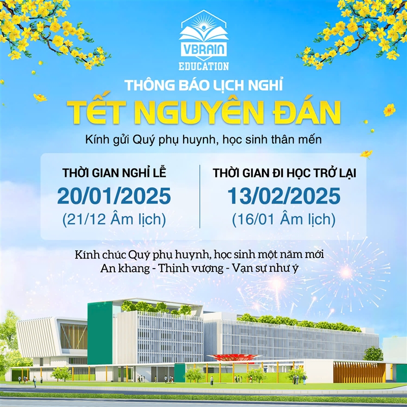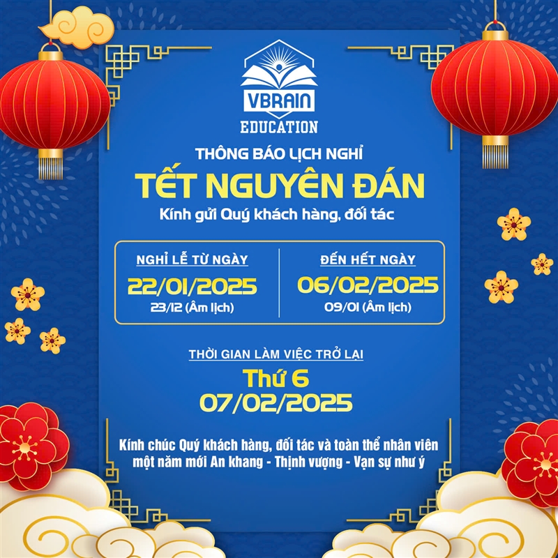 Trong không khí đón xuân mới, Hệ thống Giáo dục Vbrain xin gửi lời cảm ơn chân thành đến quý khách hàng và đối tác đã luôn đồng hành và ủng hộ chúng tôi trong suốt thời gian qua. Chúng tôi vô cùng trân trọng mối quan hệ hợp tác tốt đẹp và hy vọng sẽ tiếp tục gặt hái nhiều thành công trong năm mới.